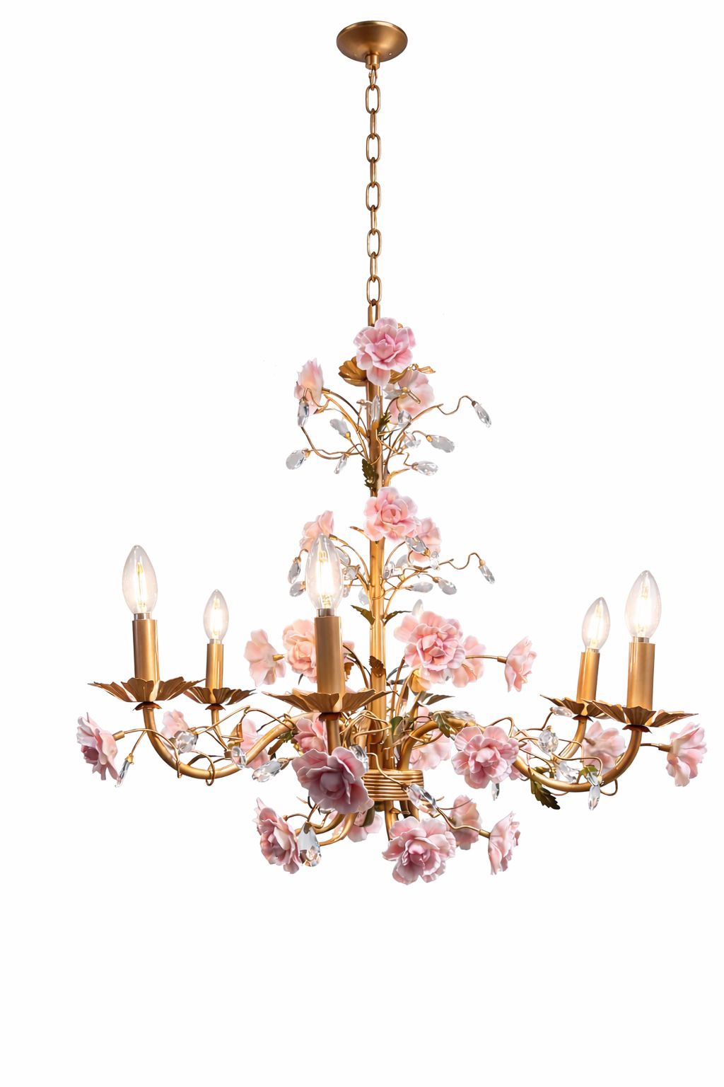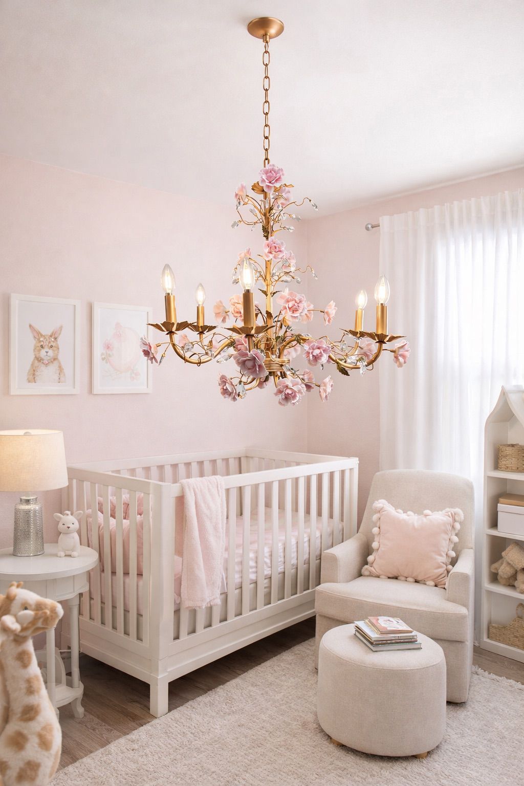 A romantic gold-leaf chandelier adorned with hand-crafted pink porcelain peonies and sparkling crystal blossoms. Soft, feminine, and perfect for luxury nurseries or elegant interiors.